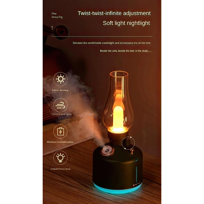 For a cozy atmosphere, place our Humidifier with Lantern Light next to your desk, bed, or sofa. Its gentle light fills your space with coziness. It keeps the air pure and fresh. Additionally, you won't have to bother with untidy cords because it's wireless. The peaceful, multicolored fence lamp is a lovely accent that won't annoy you.